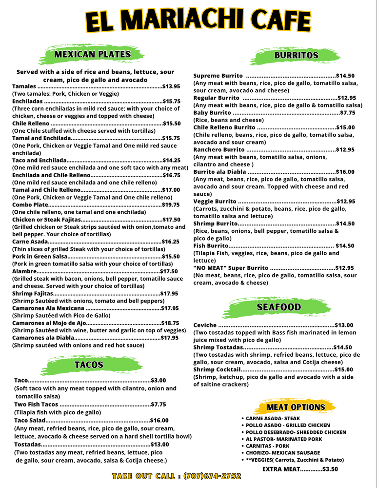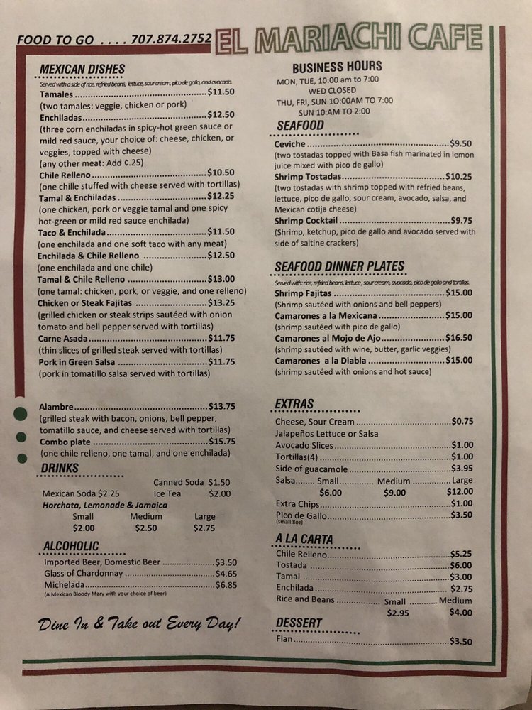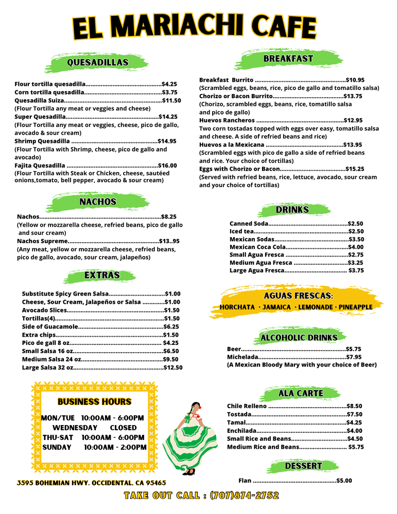 El Mariachi Cafe, located in Occidental, CA, is a cozy breakfast and brunch spot offering delicious Mexican cuisine. With a variety of vegetarian options, this casual eatery provides a range of amenities including takeout, delivery, and outdoor seating. Customers rave about the flavorful dishes such as el pastor tacos, enchiladas, huevos rancheros, and shrimp quesadillas. The staff's friendly service and the inviting patio make for a pleasant dining experience. The menu features well-executed classics like perfectly cooked chicken enchiladas and a flavorful verde sauce. Whether you're stopping by for lunch or happy hour specials, El Mariachi Cafe is a must-visit spot for authentic Mexican flavors in a relaxed atmosphere. Don't forget to bring your own container and enjoy the covered outdoor seating with free Wi-Fi.